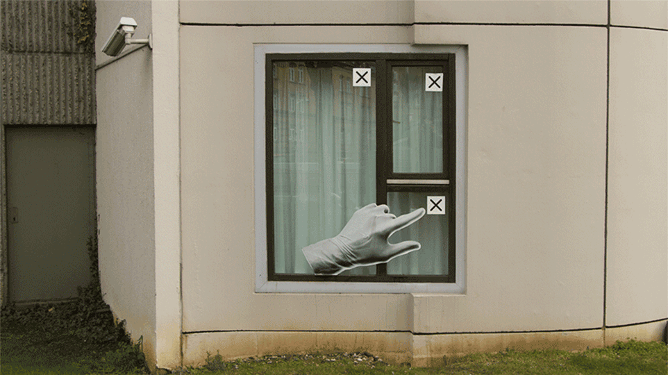 The artist paste many stickers on the windows. Between each collage, a photo is taken. With these photos the artist to create an animated gif. This animated gif enhances the "IRL" architecture with interactions specific to digital architectures.